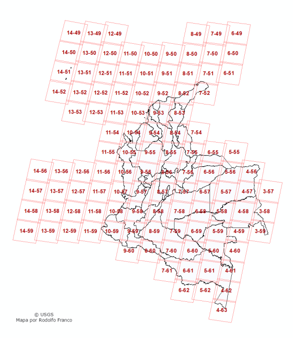 Para el territorio colombiano las escenas Landsat se codifican entre las columnas (Path) 3 a la 14 y de las filas (Row) 49 a la 63. La siguiente imagen muestra el cubrimiento Landsat para el país: