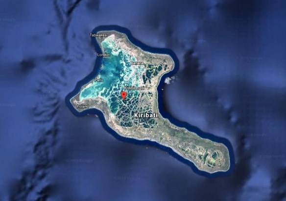 «Kiritimati» es la palabra equivalente a «Navidad» en el idioma Kiribati, es el atolón más extenso del mundo con un área de 388 km cuadrados y unos 150 km de perímetro. De acuerdo con su censo para 2015 tenía unos 6447 habitantes distribuidos en unas pocas villas siendo Tabwakea la mayor poblada. Entre los cambios que ha tenido la Línea Internacional del Cambio de Fecha está que en 1995 se dejó a Kiritimati al lado oeste de la misma, desde entonces sus habitantes son los primeros en el mundo en gritar «Happy new year!» o cómo se diga en el idioma Kiribati.