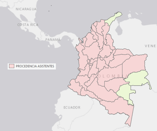 La mayoría han sido asistentes de Bogotá pero algunos desde El Espinal, Ibagué, Melgar, Coyaima, Chaparral y Líbano (Tolima), Amalfi, Santa Bárbara, Santa Fe de Antioquia, Sabaneta, Puerto Berrío, Santuario, Guarne, Medellín, Cocorná, Valle de Toledo, Urrao, San Rafael, Jericó y Apartadó (Antioquia), Armenia (Quindío), Cali, Buenaventura, Andalucía, Sevilla y Palmira (Valle), Pereira y Santa Rosa de Cabal (Risaralda), Pasto, Tumaco, Guachucal, Ipiales y Chachagüí (Nariño), Barrancabermeja, Málaga, Bucaramanga, Jesús María y San Gil (Santander), Neiva, Garzón, Isnos, La Plata y San Agustín (Huila), Manizales (Caldas), Yopal, Aguazul, Tauramena, Paz de Ariporo, Monterrey y Villanueva (Casanare), Cúcuta y Tibú (Norte de Santander), Zipaquirá, Cajicá, Madrid, Gachalá, Guaduas, Cachipay, Soacha, Viotá, Sesquilé, La Mesa, Pacho, Cogua y Chía (Cundinamarca), Villavicencio, San Martín, Puerto Gaitán y Acacías (Meta), Montería, Sahagún, Planeta Rica y Cereté (Córdoba), Cartagena, Carmen de Bolívar, San Pablo y Zambrano (Bolívar), San Marcos (Sucre), Popayán (Cauca), Barranquilla y Sabanalarga (Atlántico), Tunja, Sogamoso, Socha, Belén, Tenza, Cómbita, Arcabuco, Duitama, Chiquinquirá, Garagoa, Muzo, Villa de Leyva y Firavitoba (Boyacá), Saravena y Arauca (Arauca), Santa Marta (Magdalena), Puerto Carreño y La Primavera (Vichada), Istmina y Río Sucio (Chocó), Valledupar, Bosconia y La Loma (Cesar), San José del Guaviare (Guaviare), Florencia y San Vicente del Caguán (Caquetá), Mocoa (Putumayo) y Leticia (Amazonas).