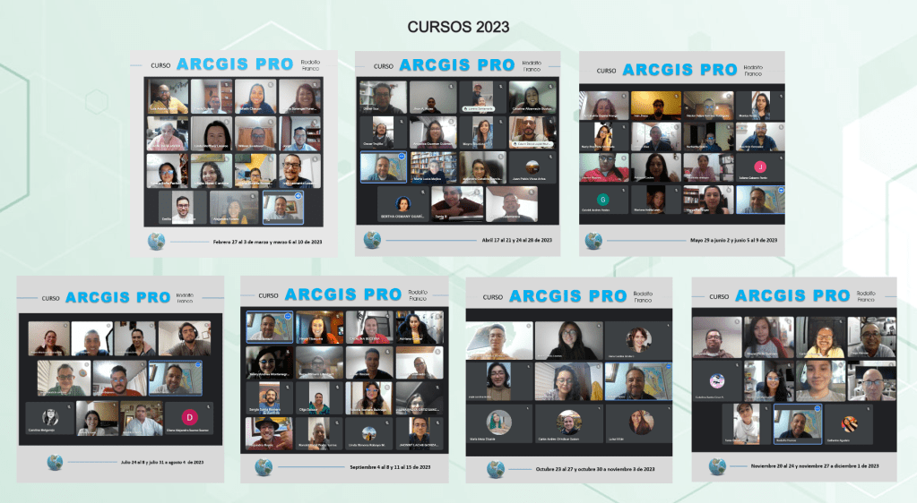 A la fecha y contando también los cursos que hacía antes del software anterior (ArcGIS Desktop), son ya 16 años de clases particulares con 145 ediciones desarrolladas en las que han participado un total de 1074 asistentes de variadas profesiones, ciudades, empresas y nacionalidades. Ahora los cursos son de ArcGIS Pro y durante el año realizo unos 5 o 6 cursos más o menos cada dos meses.