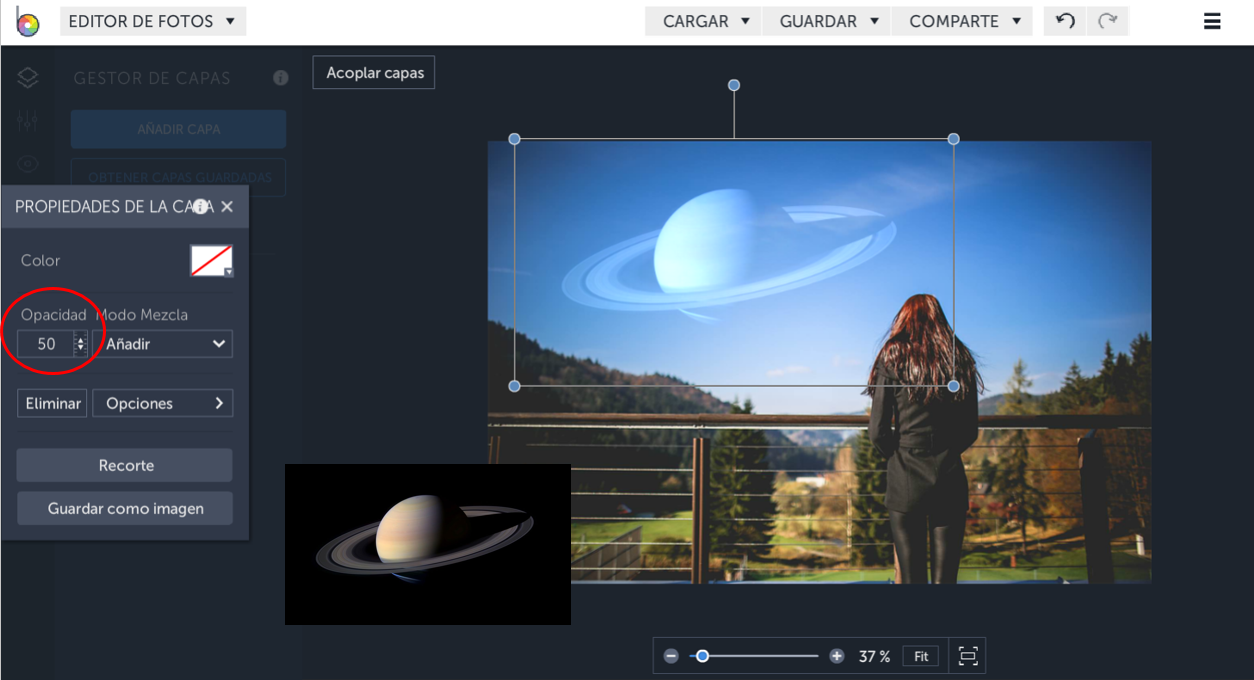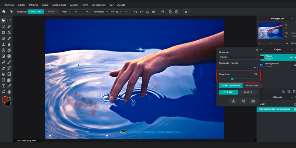 Una de las herramientas común en la edición fotográfica es el uso de la transparencia o desvanecimiento (fade). A mayor transparencia menor opacidad. Este efecto se puede aplicar especialmente en el uso de capas, pero también al momento de usar texturas, clonaciones y otras opciones de forma que el diseñador decide su intensidad.