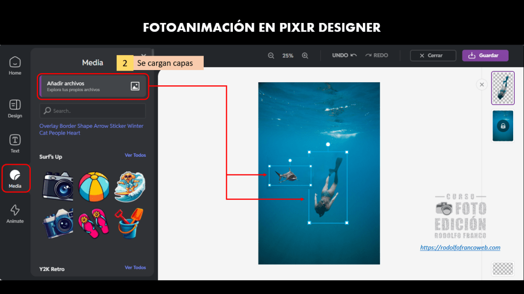 Las siguientes láminas muestran el proceso básico para una fotoanimación en PIXLR DESIGNER. Clic en cada lámina para ampliar