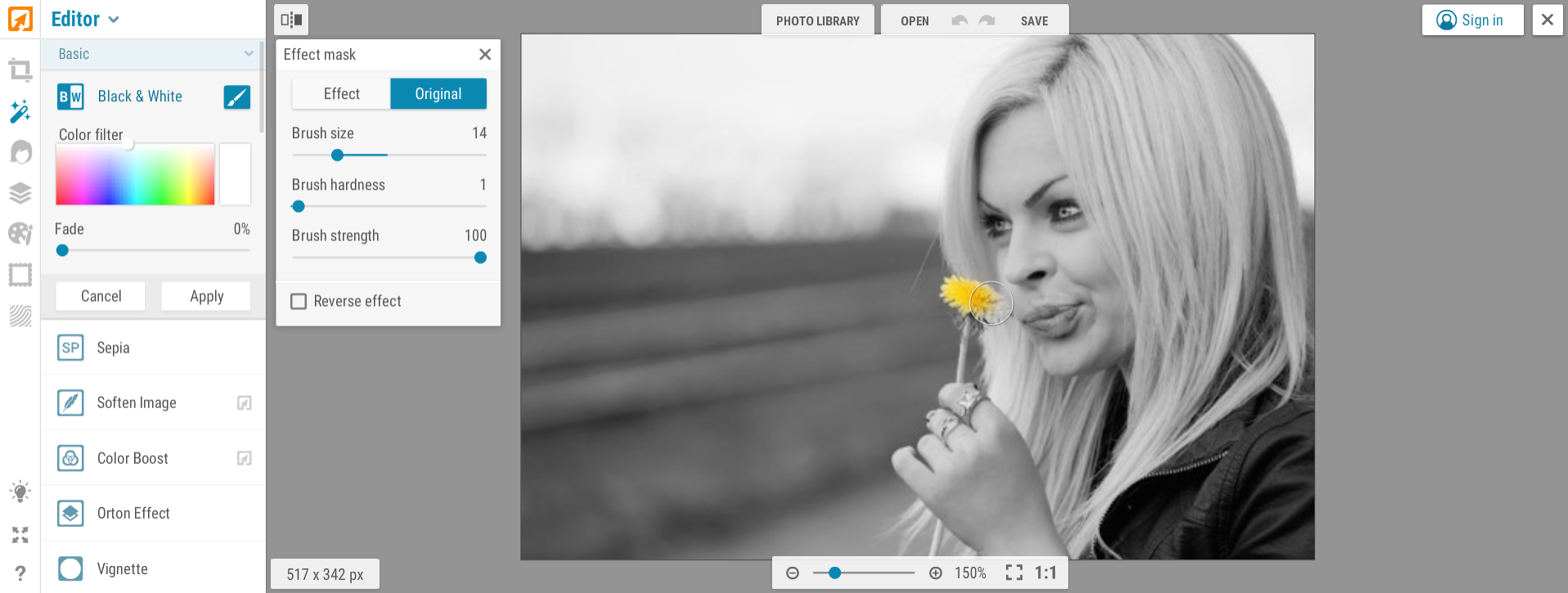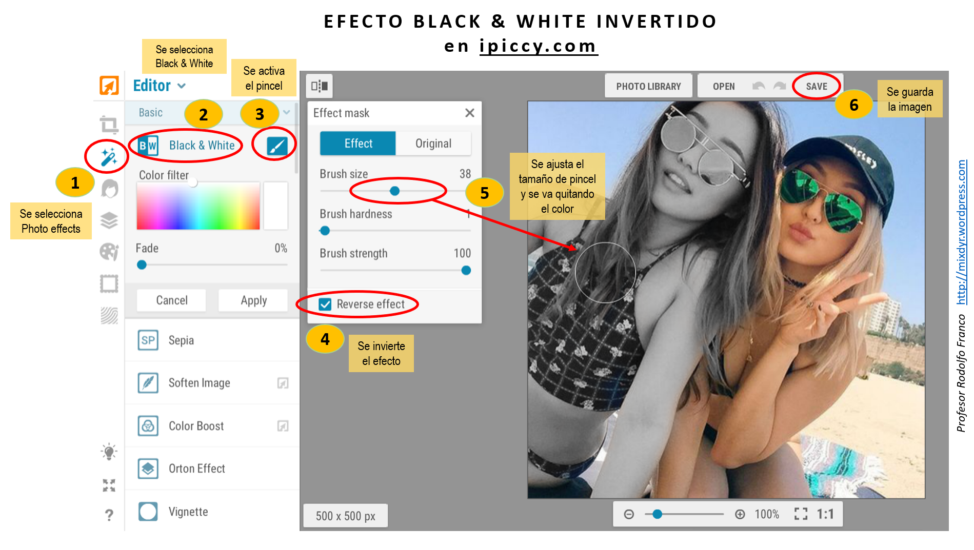 El efecto Color B&W (Black & White) permite que una imagen se convierta en tonos de grises y luego usar pincel para que una parte específica conserve su color original.