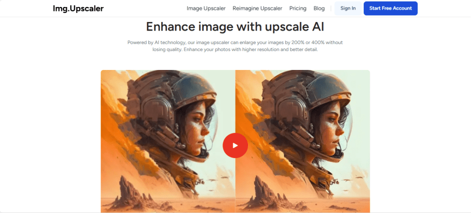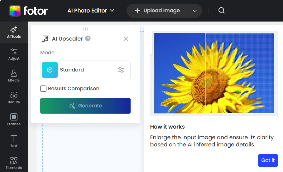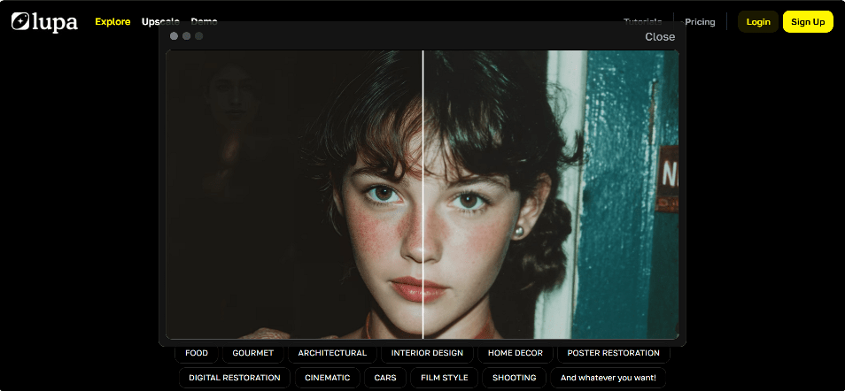 Lupa Upscaler ofrece resultados de alta calidad. Funciona con fotografías e ilustraciones. Brinda detalle a imágenes faciales sin perder la identidad del individuo. El modo de creatividad puede generar nuevos elementos expresivos