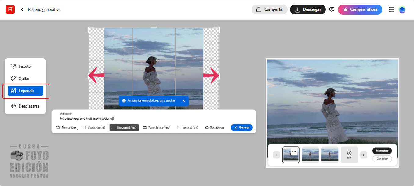 La expansión generativa es una herramienta que permite extender el tamaño de una imagen y la inteligencia artificial se encarga de crear el escenario en el espacio agregado. La expansión puede, en algunos casos, estar sujeta a una descripción textual.