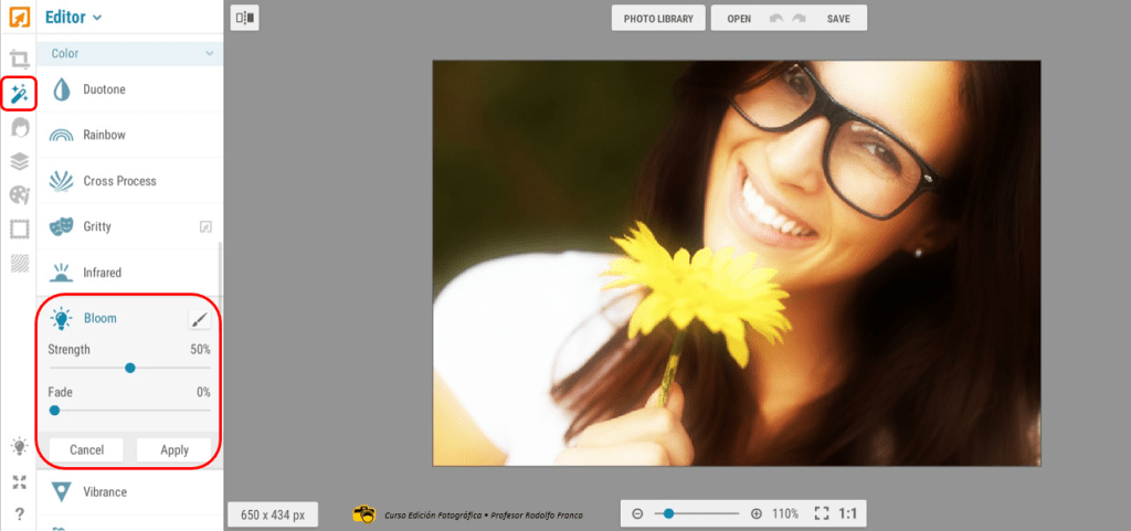 Los siguientes son ejemplos de uso del filtro de bloom o resplandecer:
