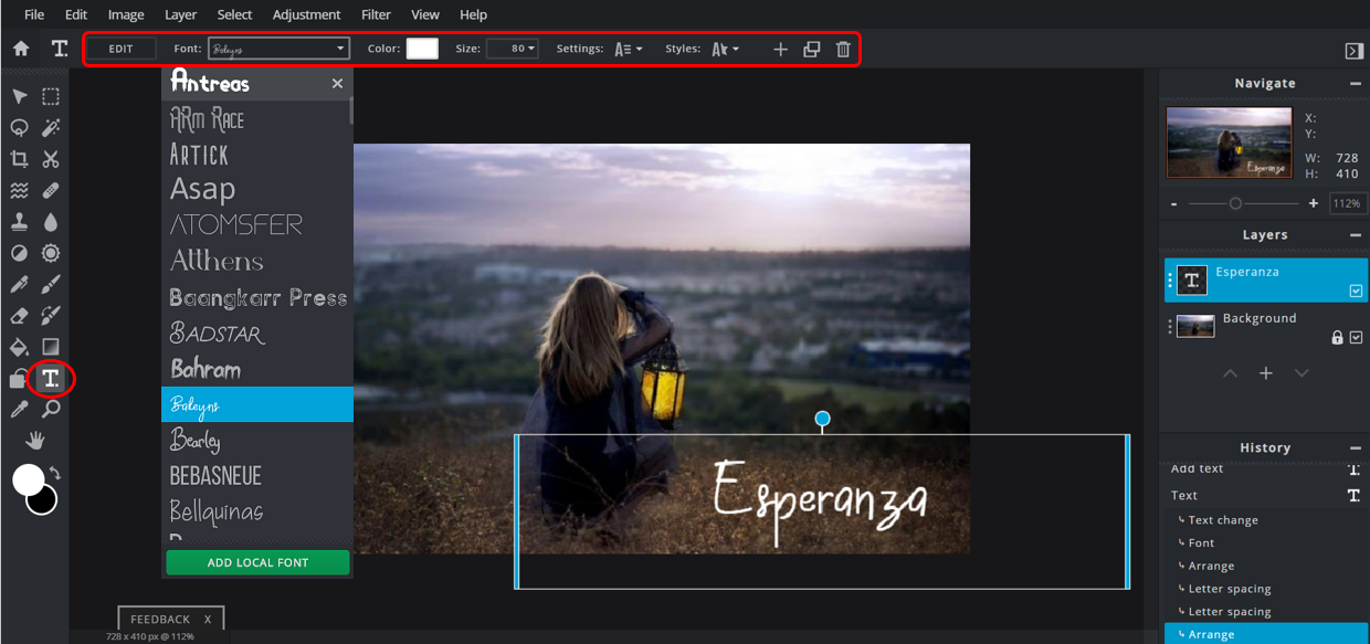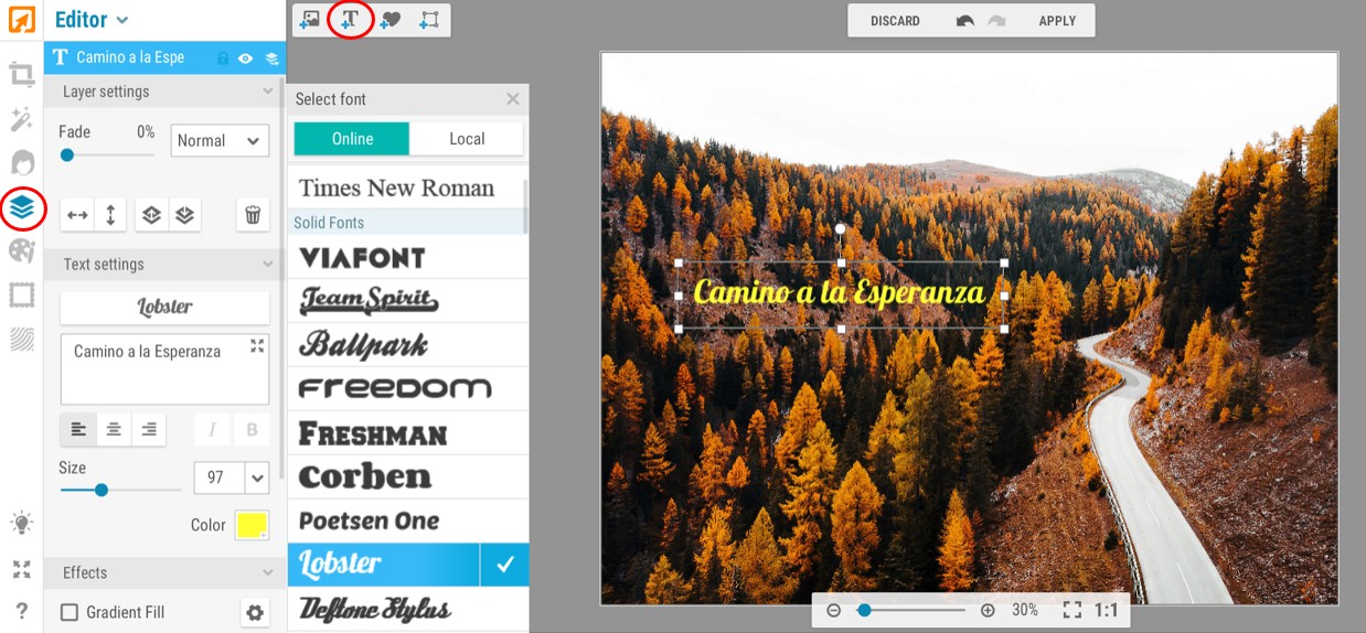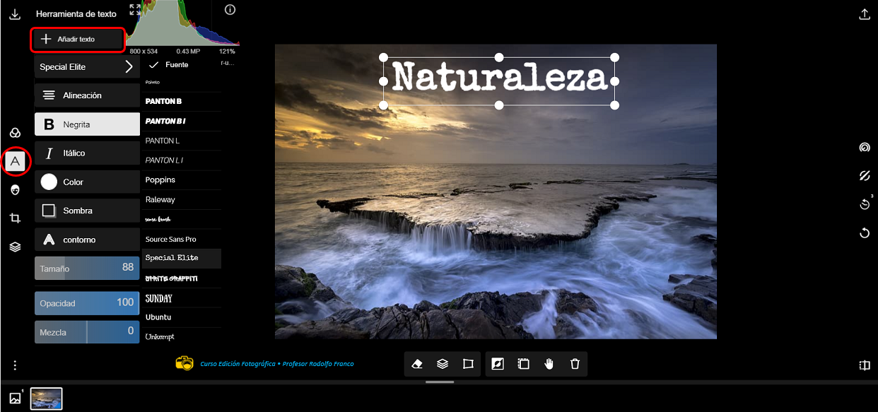 La mayoría de fotoeditores permiten agregar textos. Los textos son útiles para crear imágenes con mensajes tipeados y/o para firmarlas. Como se aprecia en la siguiente fotoedición, los textos se comportan como capas y se les puede modificar fuente, tamaño, alineación, color, contorno, perforación, sombreado, entre otros ajustes.