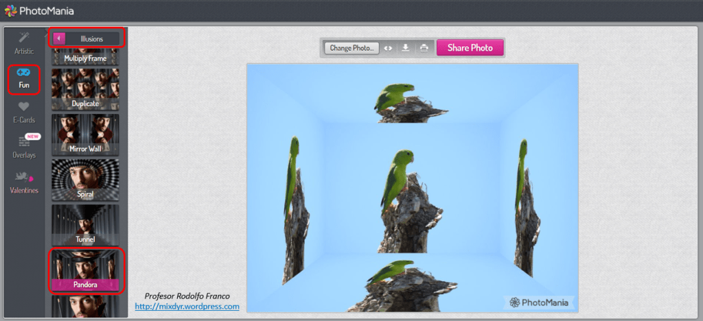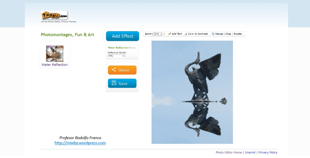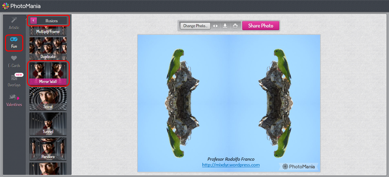 Algunos editores online brindan opciones para generar imágenes con su reflejo o efecto espejo. Generalmente la configuración es predeterminada por el aplicativo, pero en ocasiones es posible elegir cuantos reflejos, el eje de la división de las réplicas y otras acciones. A continuación, algunos ejemplos: