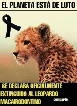 Puede que llame la atención ecológica, pero fue mentira que se extinguió en Leopardo Macairodontino, que el planeta está de luto, bla, bla, bla. Sencillamente los felinos macairodontinos ya estaban extintos hace 11 mil años y no eran como en la foto. Todo fue otra de esas falsas cadenas con aire de preocupación por la naturaleza.