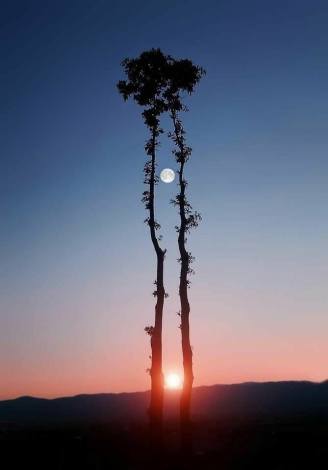 Otra muy popular pero que es sencillamente imposible. No se necesita conocer mucho de astronomía para saber que cuando ocurre Luna llena es en posición opuesta al Sol y no en el mismo horizonte, así que esto es un astromontaje.