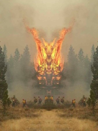 Otra imagen que quiere levantar misterio entre pendejos. La han subido a muchos sitios argumentando “El diablo aparece en un incendio en California”. Es muy claro que es una imagen a la que se le ha hado reflejo sobre sí misma y da ese efecto, nada más, cual demonio ni que nada.