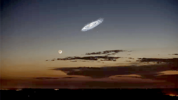 No, no esperen ver esto en ninguna noche. Supuestamente es la Galaxia de Andrómeda y la Luna en una foto tomada en Suecia. Se trata de un montaje solo para ver sus tamaños relativos en el cielo nocturno, pero realmente así no se ve nuestra vecina galáctica. Por otra parte, la posición de la Galaxia de Andrómeda en el firmamento está lejos del recorrido que hace la Luna en el cielo a lo largo del año, así que la imagen es falsa.