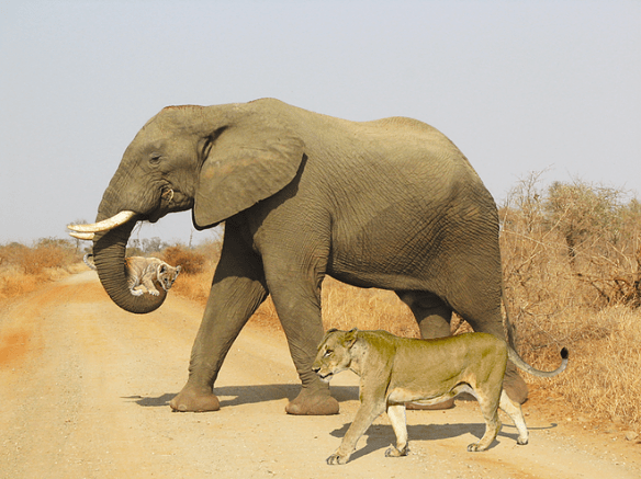 En 2018 se reprodujo por doquier la supuesta imagen de un elefante ayudando a llevar la cría de una leona, pero que absurdo!! y aún así hubo personas que la compartían y comentaban “que lindos y buenos son los animales”. Como se puede apreciar arriba, es un fácil montaje a partir de tres fotos distintas.