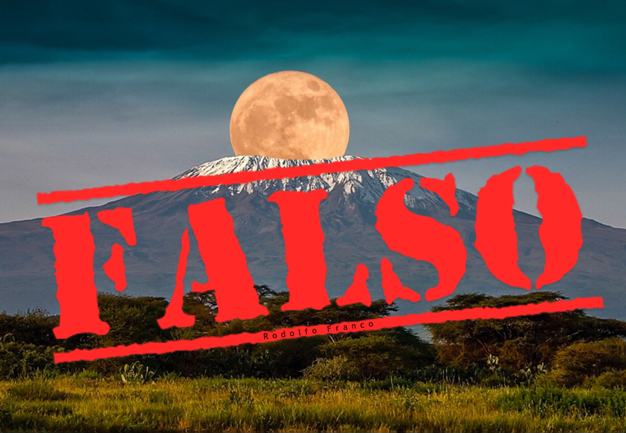Ésta imagen realmente es un montaje de la Luna llena sobre el volcán Kilimanjaro en Tanzania, África, pero la han compartido como si fuera el Nevado del Huila en Colombia.