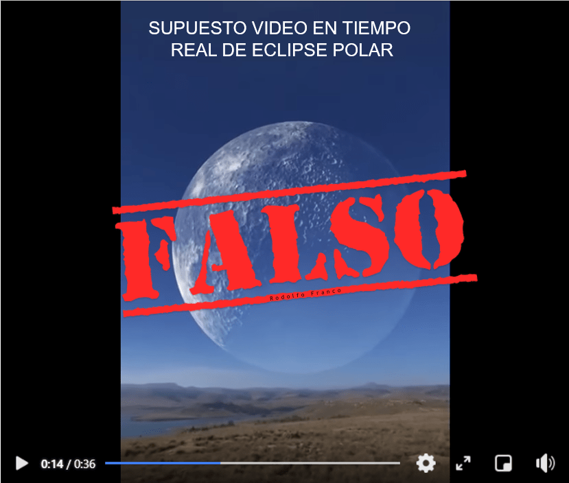No solo hay falsas imágenes astronómicas virales, también hay videos muy fake como el que compartieron en 2021 de un supuesto eclipse solar polar visto entre Rusia y Canadá. Si bien en esas altas latitudes el Sol y la Luna se ven bajos sobre el horizonte, las proporciones de tamaños y la duración que mostraba dicho video eran ridículos, era una animación irreal. Los más recientes en el polo norte ocurrieron en marzo de 2015 junio de 2021 y no se veían así. Incluso uno de ellos era solar anular (se veía el sol tapado como formando un anillo de fuego). Una imagen y videos reales del evento se pueden ver en https://earthsky.org/tonight/annular-solar-eclipse-on-june-10-2021/