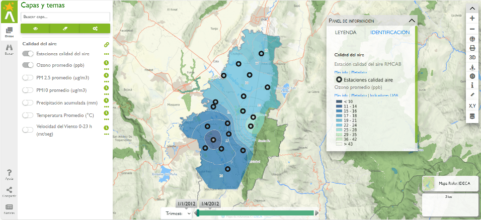 Entre los recursos del Visor Geográfico Ambiental de la Secretaría Distrital de Ambiente figura un módulo relacionado con calidad del aire. Comprende datos de promedios trimestrales y anuales de ozono, particulado PM 2.5, PM 10, precipitación acumulada, temperatura y velocidad del viento.
