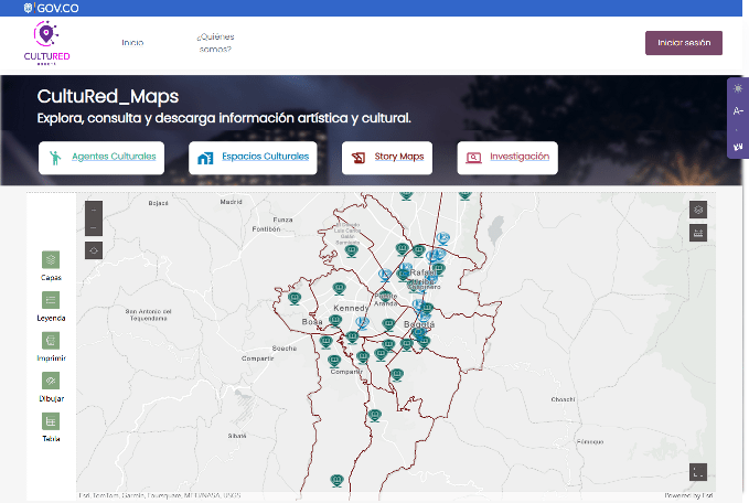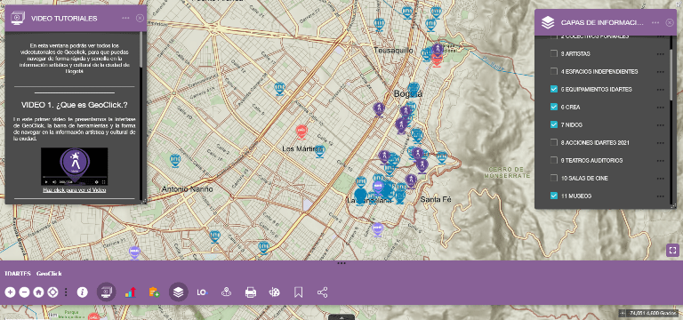 Geovisor del Instituto Distrital de las Artes – IDARTES. Despliega información de colectivos y redes colaborativas, colectivos formales, artistas, espacios independientes, equipamientos IDARTES, centros de formación artística, espacios de formación artística para la primera infancia (NIDOS), acciones artísticas y culturas adelantadas por la entidad, teatros, auditorios, salas de cine, museos, galerías, centros culturales, bibliotecas y otros.