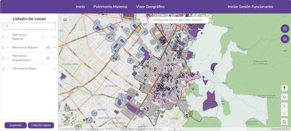 Sistema de Información del Patrimonio de Bogotá, SISBIC, del Instituto Distrital de Patrimonio Cultural, IDPC. Aporta información del patrimonio material, natural y arqueológico de la ciudad. Comprende un visor geográfico, dashboard y otros servicios de consulta.