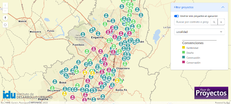 También el IDU cuenta con un visor de proyectos donde los georreferencia y clasifica según su estado (factibilidad, diseño, construcción o conservación).