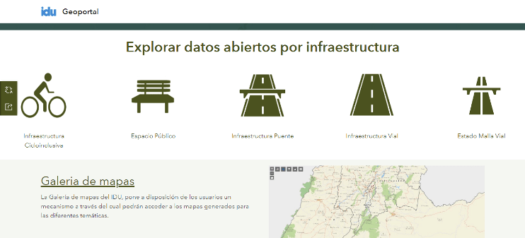 La Dirección Técnica de Inteligencia de Negocio e Innovación del Instituto de Desarrollo Urbano, IDU, dispone en su geoportal de un Sistema de Información Geográfica SIGIDU para el seguimiento sus proyectos, una sección de datos abiertos y estadísticas en temas de ciclorutas, espacio público, malla vial y puentes.