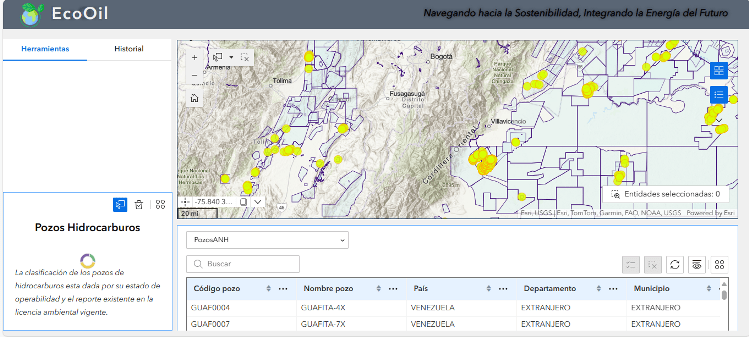 EcoOil es un geovisor para la identificación de plataformas abandonadas en la industria de hidrocarburos, fue desarrollado por Hernán D. Camelo y Laura Daniela Tavera, estudiantes de la especialización en Sistemas de Información Geográfica de la Universidad Distrital. Ver storymap descriptivo Aquí