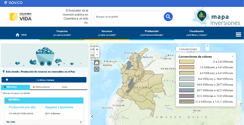 Mapa Inversiones es una plataforma de la Dirección Nacional de Planeación, DNP, con mapeo y tableros de control sobre proyectos de inversión pública, recursos involucrados, producción y fiscalización de recursos naturales no renovables