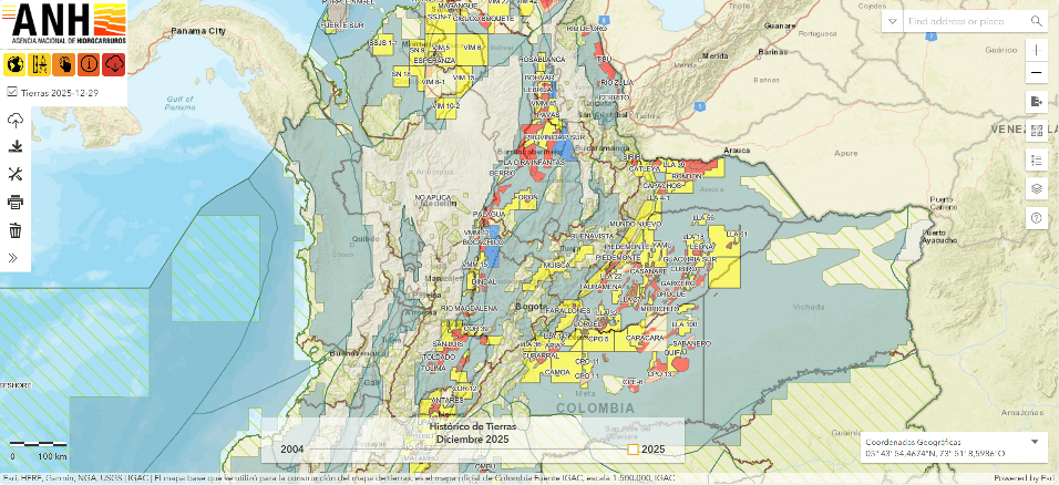 En el geovisor Mapa de Tierras de la Agencia Nacional de Hidrocarburos, ANH, se pueden consultar las áreas hidrocarburíferas del país y sus operadores