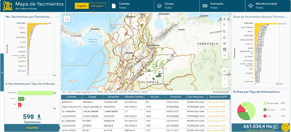 En este geovisor la ANH despliega la localización y estadísticas de los yacimientos presentes en campo de hidrocarburos.