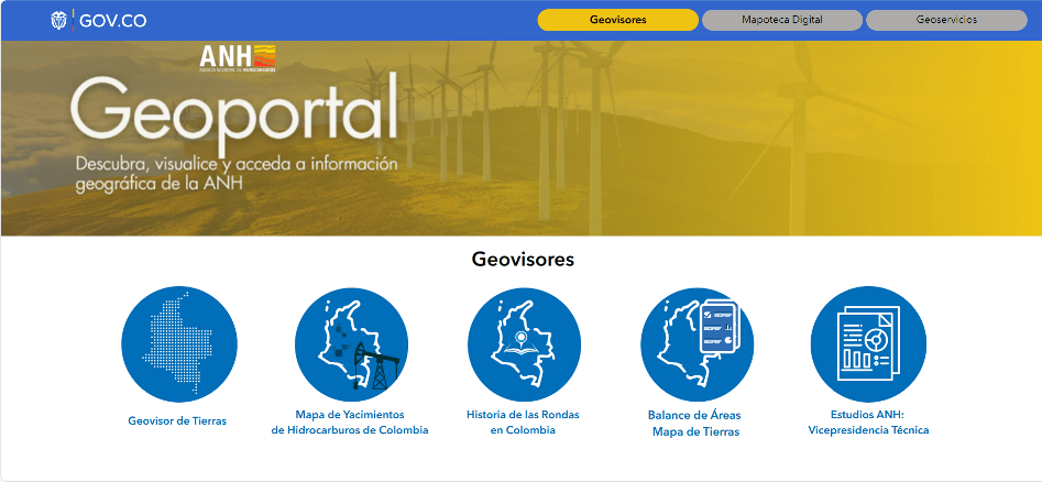 A través del Geoportal de la Agencia Nacional de Hidrocarburos, ANH, es posible acceder a diversos geovisores, geoservicios y otros recursos de información espacial generada por la entidad. Entre los geovisores está el Mapa de Tierras, Mapa de Yacimientos de Hidrocarburos, un histórico de rondas de asignación de potencial de áreas y dos tableros estadísticos relacionados, uno relacionado con el mapa de tierras y otro sobre estudios técnicos contratados.