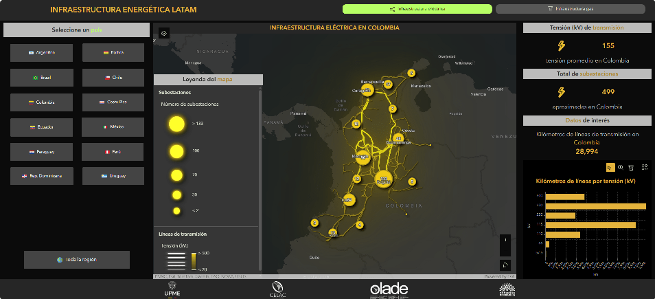 La Unidad de Planeación Minero Energética de Colombia, UPME y la Organización Latinoamericana y caribeña de Energía, OLACDE, han dispuesto de un tablero con datos de la infraestructura eléctrica y de gas en Latinoamérica. Entre los ítems se puede filtrar para las estadísticas específicas para Colombia