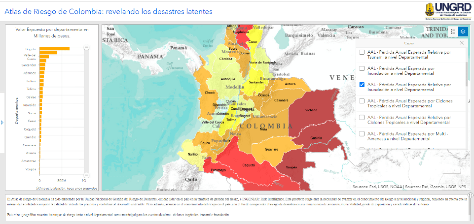 En el Geovisor Global Resilience Index Viewer se puede extraer para Colombia algunos subconjuntos de datos que ofrece esta plataforma en temas de amenazas, exposición, vulnerabilidad y riesgos de redes de infraestructuras y población.