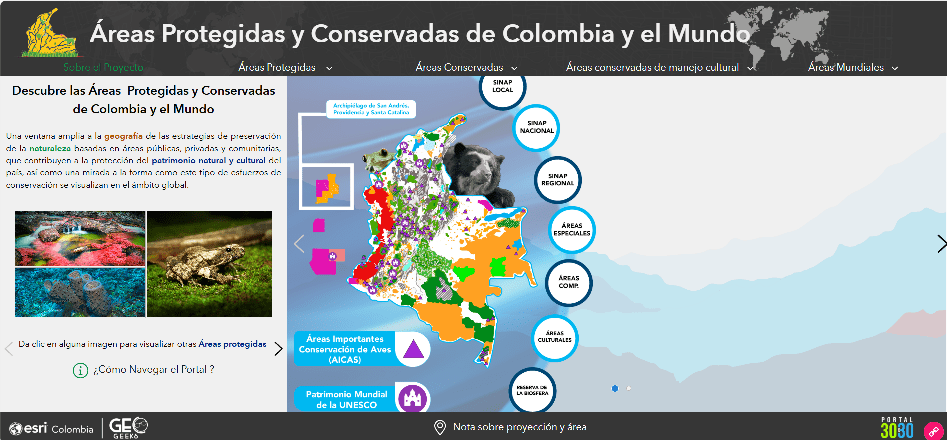 ESRI Colombia dispone de un portal para consultar áreas protegidas, áreas conservadas y áreas de manejo cultural del país. También ofrece datos de áreas protegidas del mundo.