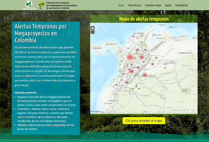 El Sistema de alertas tempranas por megaproyectos en áreas de conservación en Colombia es una herramienta informática desarrollada por la Asociación Ambiente y Sociedad que busca identificar a tiempo posibles territorios amenazados por la implementación de megaproyectos de infraestructura y de índole minero-energético.