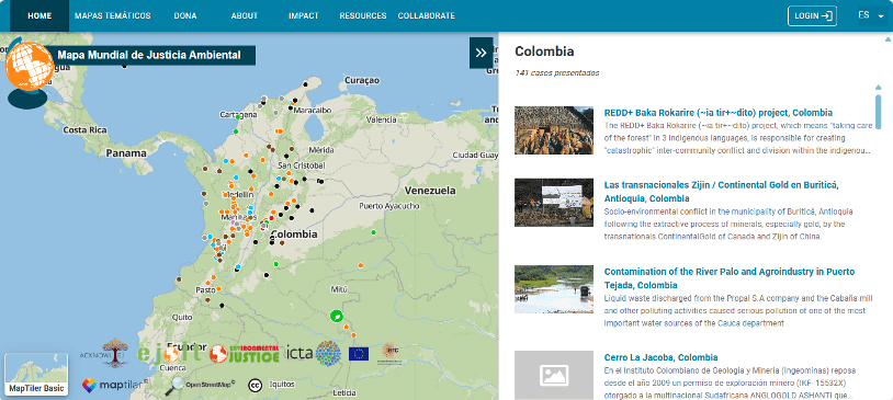 El Global Environmental Justice Atlas, EJ Atlas, es un mapa global de justicia ambiental que incluye que documenta y cataloga conflictos sociales en torno a cuestiones ambientales. La plataforma es alimentada de forma colaborativa y posee un capítulo para Colombia con más de 140 casos.