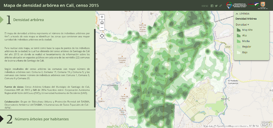 Entre las capas de la plataforma relacionadas con el censo figuran una de árboles, una capa de densidad arbórea por kilómetro cuadrado y una de individuos por cada mil hectáreas. Una vista explicativa y más ligera de estas dos últimas capas se puede consultar en https://geoportal.cali.gov.co/arcgis/apps/MapSeries/index.html?appid=9b50167b694f4e83bbeb20cd9bc977d6
