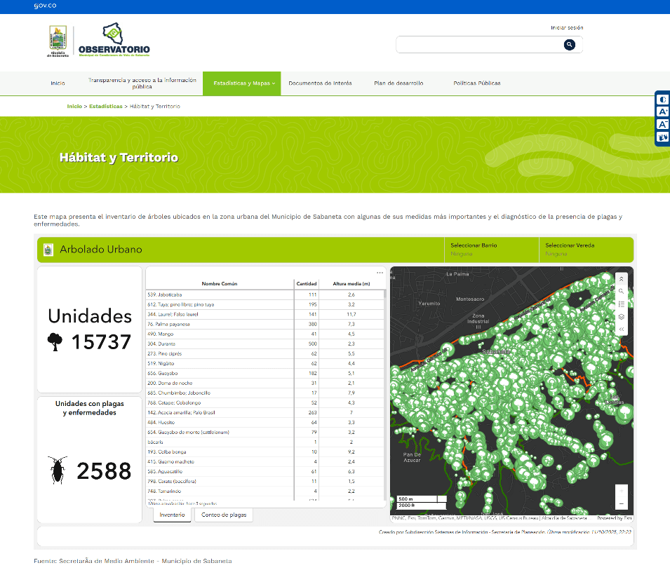 Como parte del Observatorio de Condiciones de Vida de Sabaneta está disponible información del arbolado de esta ciudad con datos aportados por la Secretaría de Medio Ambiente del municipio