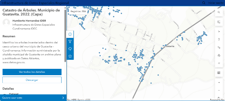 En los datos abiertos de la Infraestructura de Datos Espaciales Regional, IDER, se puede visualizar la capa del arbolado del municipio de Guatavita, Cundinamarca. Información de la Alcaldía Municipal