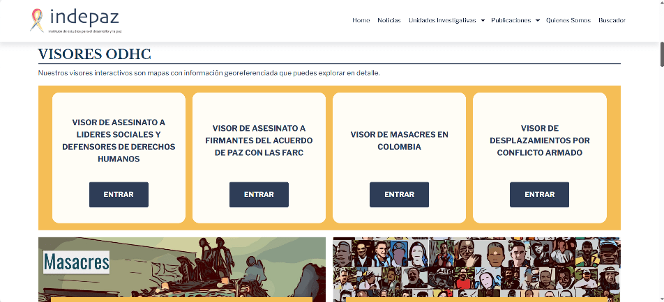 El Observatorio de Derechos Humanos y Conflictividades, del Instituto de Estudios para el Desarrollo y la Paz, INDEPAZ, cuenta con una serie de geovisores en los temas de masacres, desplazamientos por conflicto armado, asesinatos de firmantes de acuerdo de paz con las FARC y asesinatos de líderes sociales y defensores de derechos humanos