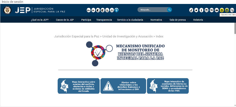 La Unidad de Investigación y Acusación de la Jurisdicción Especial para la Paz, JEP, congrega varios georecursos interactivos relacionados con riesgos del Sistema Integrado para la Paz. Comprende mapeo de eventos de conflicto, afectación a civiles y acciones estatales; alertas de violación de DDHH y mapeo de asesinatos de líderes sociales, defensores de DDHH y de excombatientes FARC