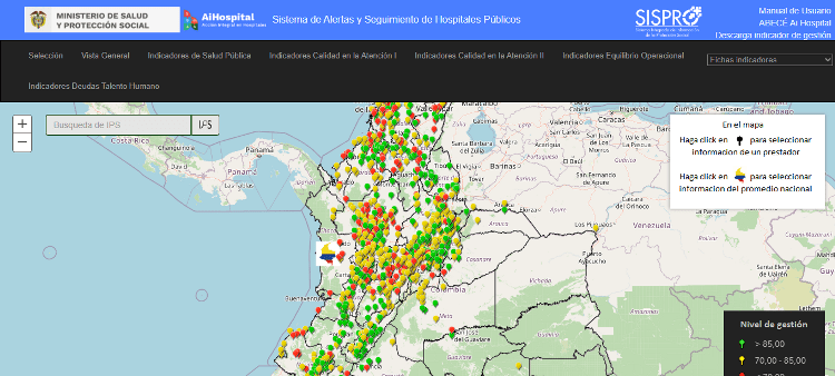 El Ministerio de Salud y Protección Social también cuenta con el Geovisor de la Acción Integral en Hospitales como parte del Sistema de Alertas y Seguimiento de Hospitales Públicos del país.