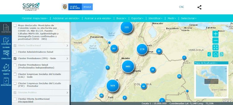 El geovisor del Sistema Integrado de Información de la Protección Social, SISPRO, es una herramienta del Ministerio de Salud y Protección Social para mapear variables, indicadores y otros ítems en temas de salud, índices sociodemográficos y de protección social.