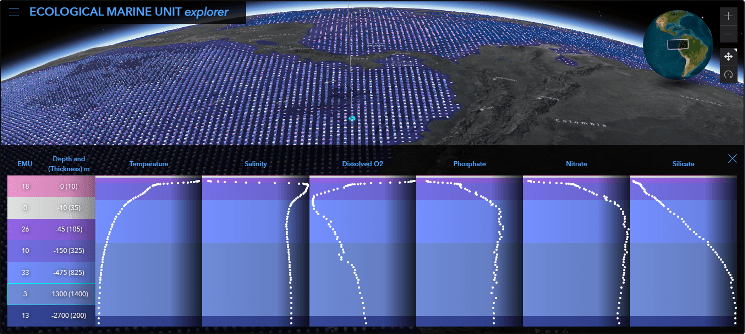 El Ecological Marine Unit Explorer, es un desarrollo de NOAA – National Centers for Coastal Ocean Science NCCOS y ESRI. Aporta información global de unidades ecológicas marinas en parámetros como la salidad y niveles de oxígeno. Estos datos pueden ser útiles para investigación de condiciones para la vida marina y la acuacultura.
