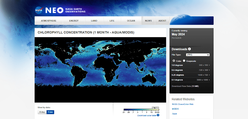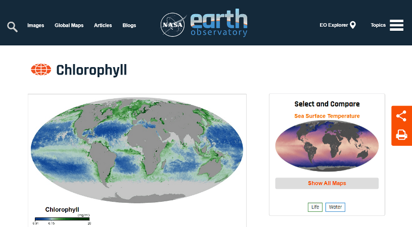 Earth Observatory de la NASA dispone de un Mapa global de concentración oceánica de clorofila animado desde el año 2002 hasta la actualidad. La clorofila es insumo energético de algas y otro fitoplancton. Esta web Incluye acceso a otros recursos de esta temática.