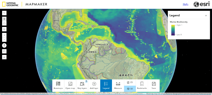 En el geovisor MapMaker de la National Geographic se pueden visualizar layers sobre biodiversidad marina y de ecosistemas varios como corales y manglares