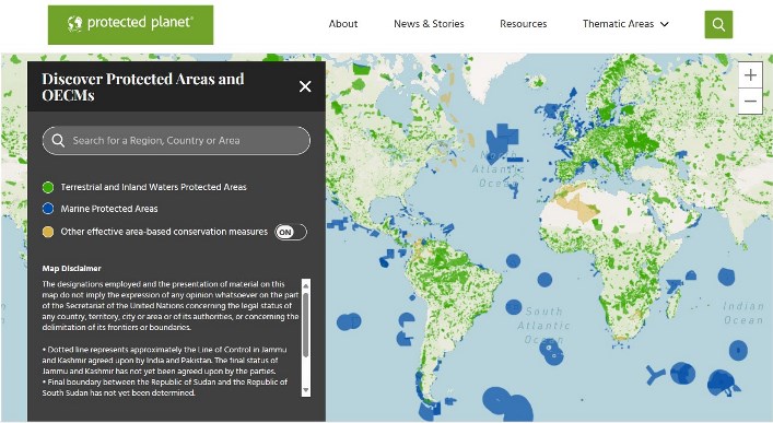 Protected Planet es una conocida y robusta plataforma de información mundial sobre áreas protegidas. Es un desarrollo con apoto de UNEP y IUCN. Maneja ocho tópicos: áreas protegidas, eficacia de la gestión, otras medidas eficaces de conservación, territorios y áreas conservadas por pueblos indígenas y comunidades locales; lista verde de áreas protegidas y conservadas de la UICN, gobernanza equitativa, conectividad y áreas marinas protegidas.