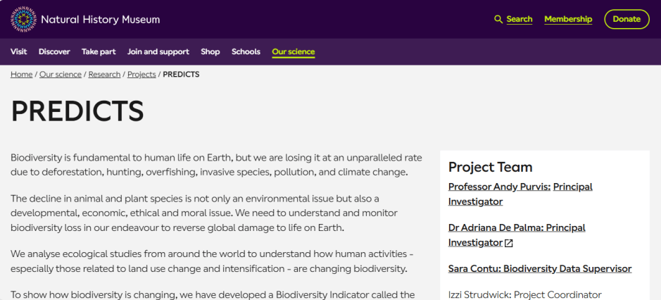 Projecting Responses of Ecological Diversity In Changing Terrestrial Systems, PREDICTS, dispone de una robusta base de datos relacionada con la respuesta de la biodiversidad al impacto humano. Es un proyecto en el que han participado más de 500 investigadores reuniendo más de 3.2 millones de registros de muestreos en más de 26 mil lugares y abarcando más de 47 mil especies. Paper descriptivo disponible aquí