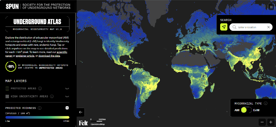 Underground Atlas permite explorar la distribución global de micorrizas arbusculares y ectomicorrizas. Las micorrizas son asociaciones simbióticas entre raíces de plantas y hongos del suelo que mejoran la absorción de nutrientes y agua. Es un desarrollo de la organización Society for the Protection of Underground Networks, SPUN.