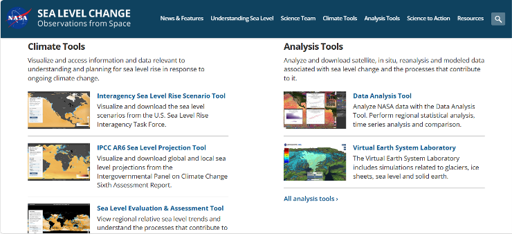 Web de la NASA con datos, geovisores y herramientas de análisis y simulación relacionadas con cambios en el nivel del mar.