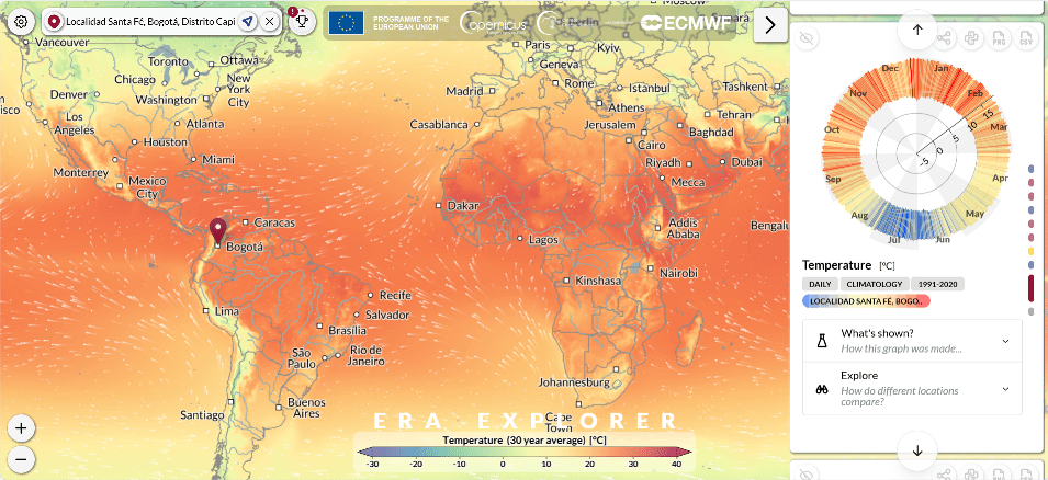 ERA Explorer es una aplicación del Climate Change Service (C3S) que permite un vistazo a datos climáticos de cualquier parte del mundo con indicadores de temperatura, precipitación, humedad relativa, viento y otros proveídos desde el dataset de reanálisis del ERA5.