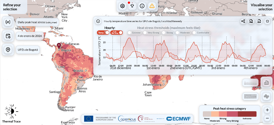 Thermal Trace es una aplicación del Climate Change Service (C3S) que permite consultar histórico de sensación térmica respecto a umbrales de estrés térmico de frío y calor para cualquier parte del mundo.